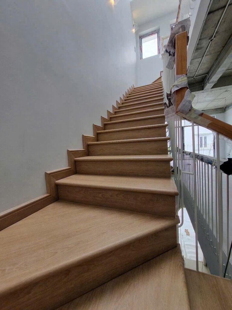 • Dán mặt bậc: Phết keo chuyên dụng đều và đủ lên mặt bậc. Đặt tấm ốp cầu thang nhựa giả gỗ lên, căn chỉnh và dùng búa cao su gõ nhẹ để keo bám dính chắc chắn.